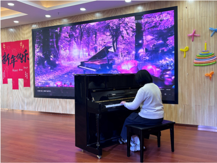 在文艺表演环节,冯铭书同学为现场老人们现场弹奏经典钢琴曲目《啊,我的太阳》。指尖起落间,温暖明亮的旋律如阳光般流淌而出,充盈着整个活动空间,老人们静静沉浸在悠扬的乐声中,琴声载着青春的问候与祝福,在现场激起阵阵暖意,构成了一幅温馨动人的画面。