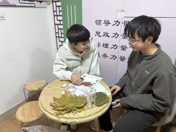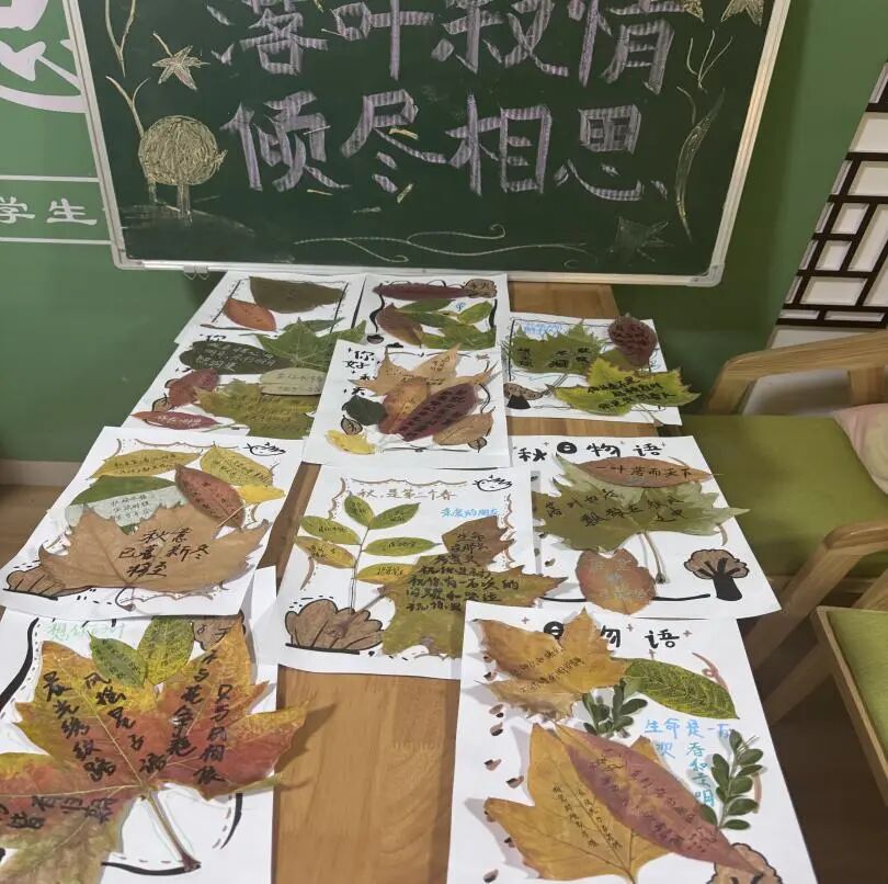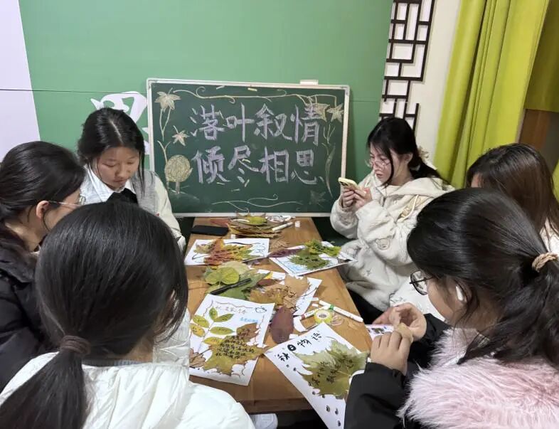 本次活动以“创意实践和情感表达”为核心,设手工创作、情感寄语环节。同学们携落叶赴场,将自然馈赠化作信笺:有人在银杏叶上写下对远方亲友的牵挂,有人在红枫叶里藏了对生活的温柔期许,再将这些“心意”错落贴在纸上,让每一片落叶都成了独属于这个秋天的浪漫注脚。