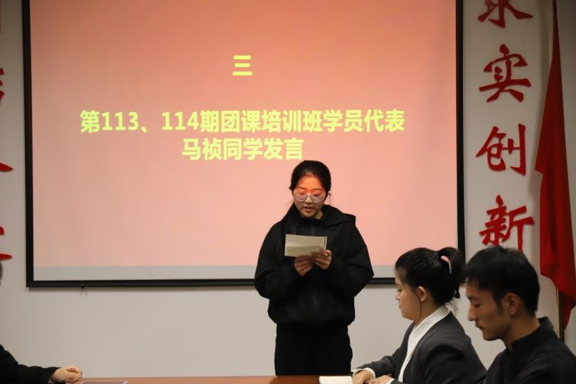 大会第三项,第113、114期团课培训班学员代表马祯同学发言。