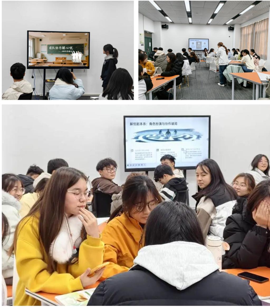 11月26日,生物科学251班同样在团辅室开展了以“团队协作解忧”为主题的班级团辅,引导同学们以集体之力解个人之忧,共建温暖的心灵港湾。在“心忧漂流瓶”游戏中,承载着同学们心事的漂流瓶为彼此所知,并收获真诚暖心的回应。“解忧剧本杀”环节通过沉浸式情景模拟体验“换位思考-分工协作-非暴力沟通”在解决心理困境中的重要作用,增强了同学们应对现实问题的能力。